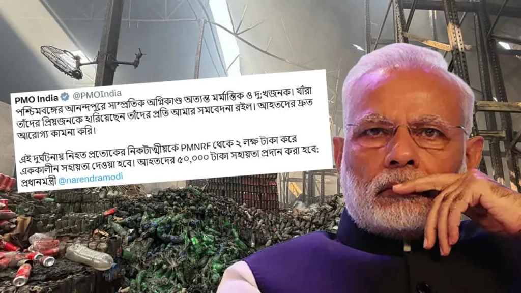 ইতিমধ্যেই আনন্দপুরে যে ভয়াবহ অগ্নিকাণ্ডের ঘটনা ঘটেছে, তার পরিপ্রেক্ষিতে প্রতিবাদ কর্মসূচি করেছে বিজেপি। আজ সেখানে মিছিল করে রাজ্যের বিরোধী দলনেতা শুভেন্দু অধিকারী একাধিক দাবি করেছেন এবং মুখ্যমন্ত্রীর অনুপস্থিতি নিয়ে প্রশ্ন তুলেছেন। আর তার মধ্যেই এক্স হ্যান্ডেলে সেই আনন্দপুরে যে ভয়াবহ অগ্নিকাণ্ড হয়েছে, সেই ঘটনায় মৃতদের পরিবারকে আর্থিক সাহায্য দেওয়ার কথা ঘোষণা করলেন প্রধানমন্ত্রী নরেন্দ্র মোদী। পাশাপাশি যারা আহত হয়েছেন তাদেরও আর্থিক ক্ষতিপূরণ দেয়ার কথা জানিয়েছেন তিনি। আর বাংলার বুকে ঘটে যাওয়া এত বড় ভয়ংকর ঘটনার খোঁজখবর যে নরেন্দ্র মোদীর কাছে থাকে এবং তিনি যে বাংলার এই ঘটনা নিয়ে ব্যাপক চিন্তিত এবং সমব্যথী, তা প্রধানমন্ত্রীর এই ঘোষণার মধ্যে দিয়েই স্পষ্ট হয়ে গেল। আর সেই কারণেই তাকে ধন্যবাদ জানাচ্ছে রাজ্য বিজেপি।