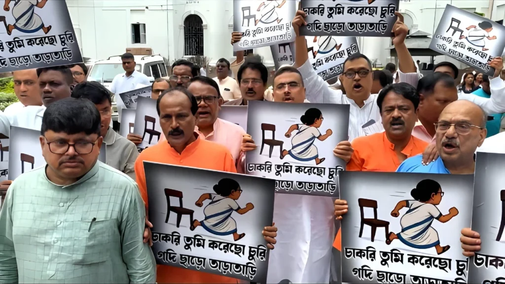 সূত্রের খবর, এদিন বিধানসভার ভেতর থেকেই প্ল্যাকার্ড হাতে বিক্ষোভ করতে করতে বাইরে বেরিয়ে আসে বিজেপি। যেখানে শুভেন্দু অধিকারীর নেতৃত্বে বিজেপির সমস্ত বিধায়করা একটি করে প্ল্যাকার্ড হাতে নেন। যেখানে লেখা ছিল, “চাকরি তুমি করছ চুরি, গদি ছাড়ো তাড়াতাড়ি।” শুধু তাই নয়, মমতা বন্দ্যোপাধ্যায়ের বিরুদ্ধে স্লোগান তুলে “চাকরি চোর, গদি ছাড়ো” বলে স্লোগান দিতেও দেখা যায় শুভেন্দু অধিকারী সহ বিজেপি বিধায়কদের। অর্থাৎ ২০২৬ এর বিধানসভা নির্বাচনের আগে যারা মেধার ভিত্তিতে চাকরি পেয়েছে, তাদের সঙ্গে বঞ্চনা করে যেভাবে দুর্নীতিকে প্রশ্রয় দিয়েছে এই রাজ্যের সরকার, তার বিরুদ্ধে আন্দোলনে শান দিতে চাইছে বিজেপি। আর সেই কারণেই শুভেন্দু অধিকারী সহ বিজেপি বিধায়কদের আজ বিধানসভার বাইরে প্ল্যাকার্ড হাতে এই বিক্ষোভ এবং শাসককে চাপে ফেলার কৌশল বলেই মনে করছেন রাজনৈতিক বিশেষজ্ঞরা।