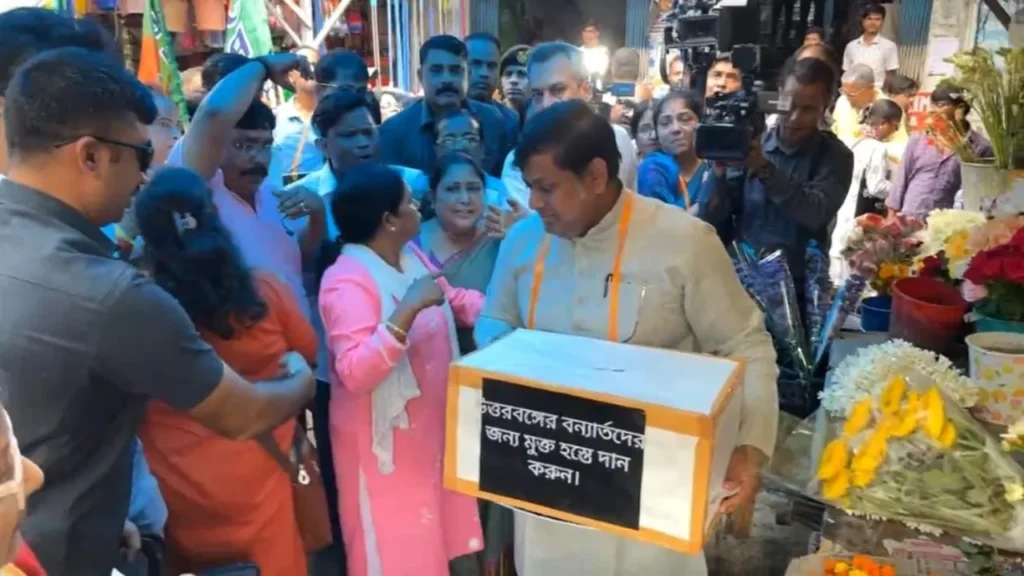 এই রাজ্যের উত্তরবঙ্গ যখন বন্যা বিপর্যয়ে বিধ্বস্ত, যখন সেখানে মানুষের মধ্যে হাহাকার লক্ষ্য করা যাচ্ছে, ঠিক তখনই সেখানকার মানুষের পাশে থাকতে বড় পদক্ষেপ নিলেন রাজ্য বিজেপির প্রাক্তন সভাপতি। এদিন গড়িয়াহাট মোড়ে উত্তরবঙ্গে বন্যা বিপর্যয় ক্ষতিগ্রস্ত মানুষদের পাশে দাঁড়ানোর জন্য অর্থ সংগ্রহে বেরিয়ে পড়লেন তিনি। যেখানে দলীয় নেতা কর্মীদের সঙ্গে নিয়ে বিভিন্ন দোকানে গিয়ে উত্তরবঙ্গের বন্যা বিপর্যস্ত এলাকায় মানুষের পাশে দাঁড়ানোর জন্য অর্থ সংগ্রহ করতে দেখা গেল কেন্দ্রীয় মন্ত্রী সুকান্ত মজুমদারকে। আর সুকান্তবাবুর এই উদ্যোগকে স্বাগত জানিয়ে কলকাতার মানুষরাও এগিয়ে এলেন সাহায্য করবার জন্য।